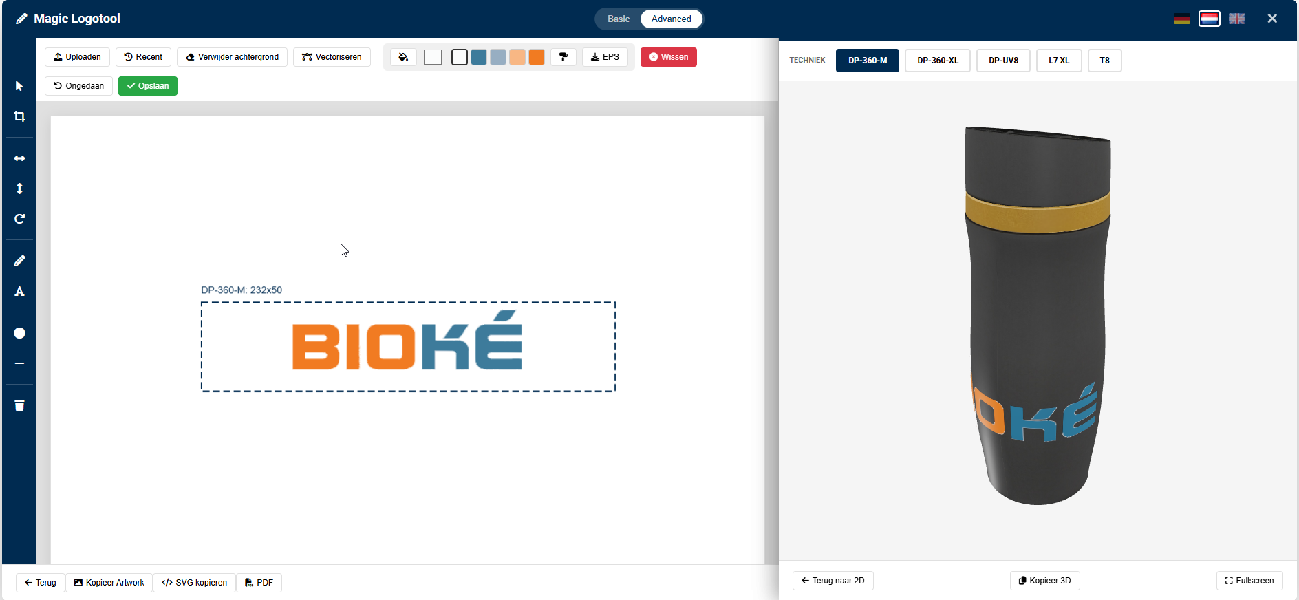 Plaats logo's op producten, bekijk ze in 2D of 3D, kies printtechnieken en voeg direct toe aan de winkelwagen. Complete logo-visualisatie voor promotional products.